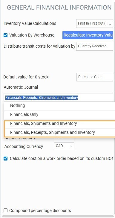Then, click on the financials tab, and verify the setting for automatic journal. If the option is not set to one of the inventory options, go ahead and skip to the next step.
