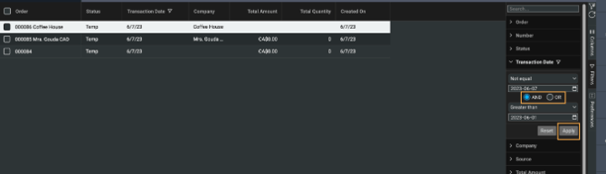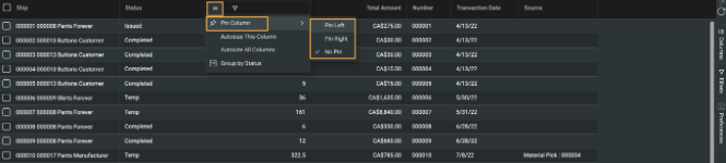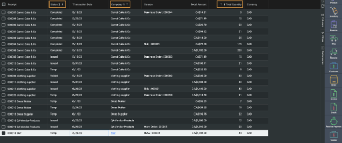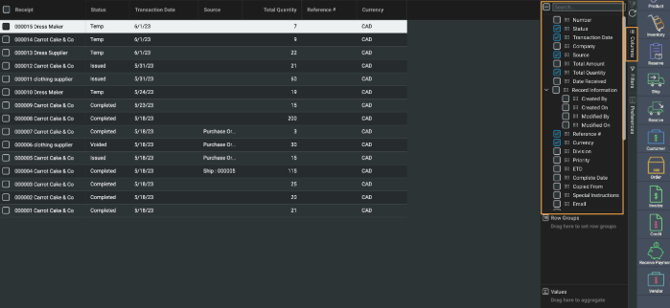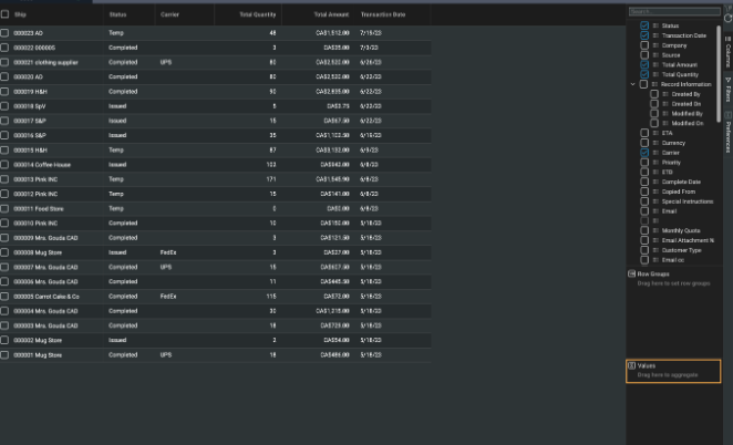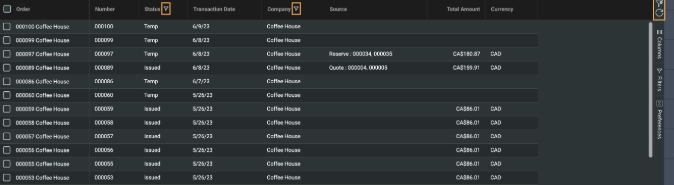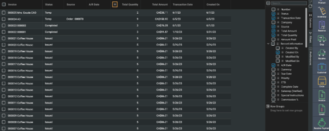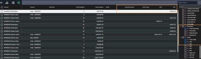 The list view for transaction modules offers extra column options, such as discounts, other charges, in transit costs, and taxes. Use the vertical scroll bar to the left of the list to see all of the column attributes available. These can also be selected to show on the list view screens. In our example, using the invoice list view, we have opted to see the columns for total discounts, total taxes, hst and gst.