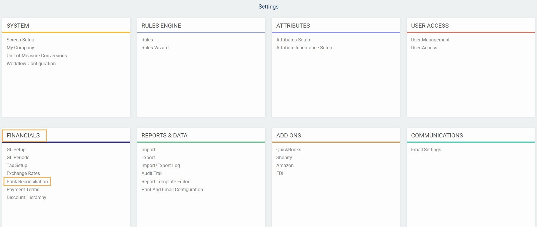 From the settings screen select the bank reconciliation option in the financials card.