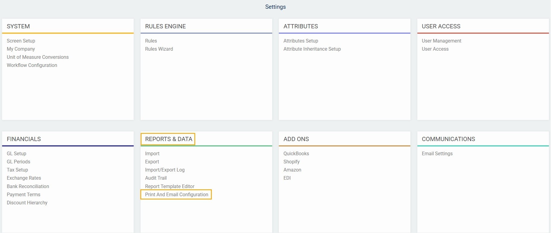 Using the report template editor along with our print and email configuration module gives you a centralized area to configure where and when each template should be used in printing and emailing through the print and email action buttons. The print configuration grid can be found in the reports and data card in the settings screen.