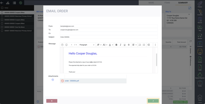 Once you are happy with your configuration, the specified template will be automatically attached to any emails you send using the email action button on any transaction.