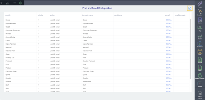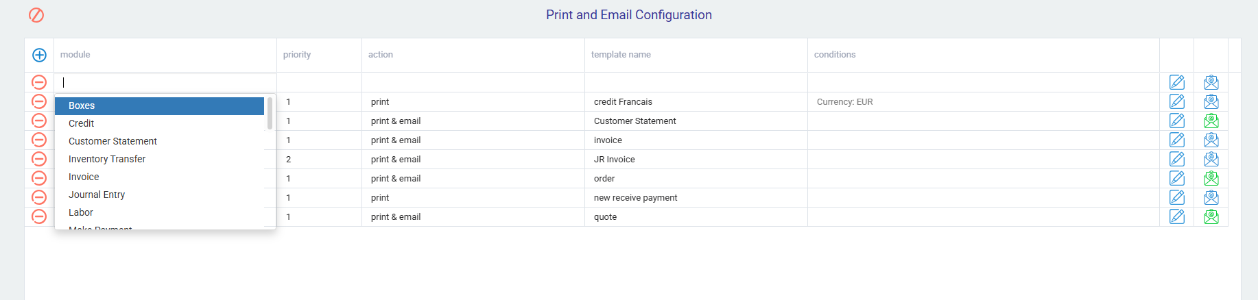 When you open the print configuration screen, you are presented with a table consisting of the following columns: module, priority, action, template and conditions, see all, and email template. To get started, click the edit button at the top of the screen. In edit mode, click the add button to create a new line.