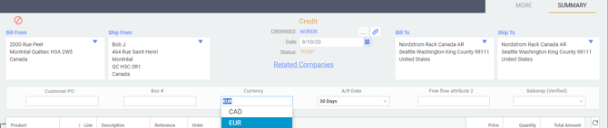 We can also fill out the attribute on the transaction itself to trigger our configurations regardless of the company being used. Therefore, if you want to quickly change to the French template on any transaction, using the currency setting, you simply have to change the currency on that transaction to EUR, and your printout will use the French template.