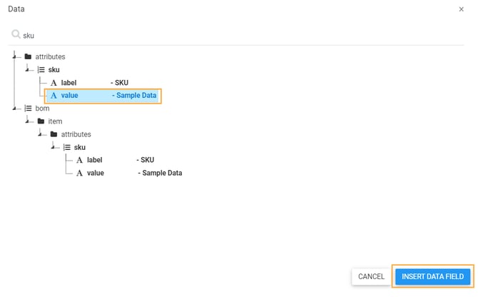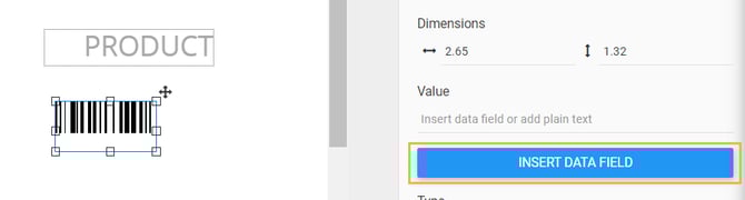 - Select the relevant data for your item (ie SKU, UPC...) and click insert data field.