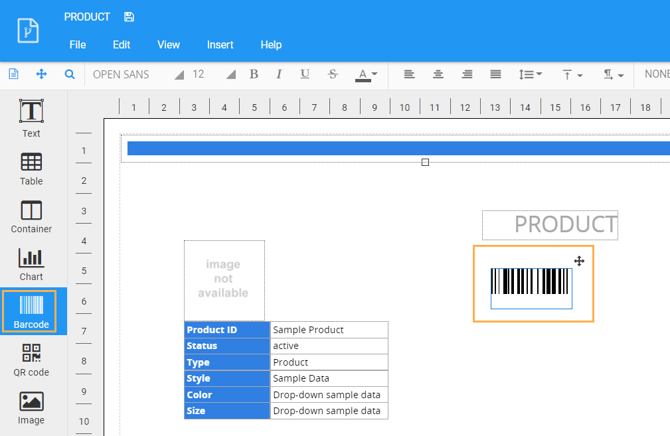 From here, you can populate your figure or text box. Click on the text box or the given cells. You can manually type anything you want to have as a permanent addition to the template. Otherwise, you can click on the text box or the cell where you would like an auto-populating input and click on insert data field to navigate to the detail you would like to obtain information from. Through this, you can link an attribute to this cell so that the value of that attribute from that specific transaction will automatically populate.