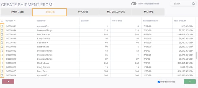Select the orders you want to use to create the shipment by checking the corresponding box on the left. To deselect an order, uncheck its box.