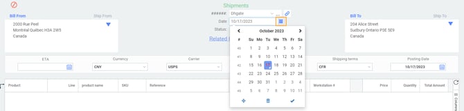 The shipment date will default to the current date. Click on the calendar icon to choose another date if required.
