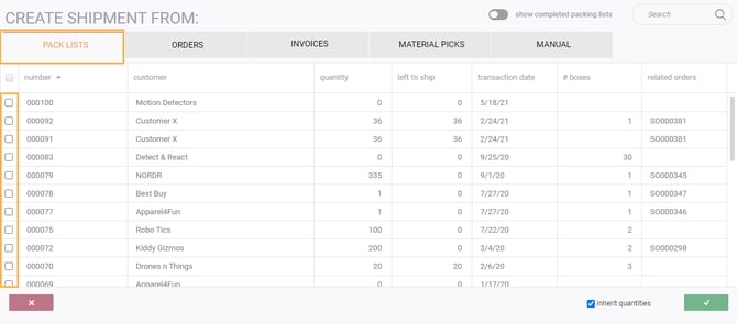 Select how you would like to create the shipment. In this case, make sure the pack lists tab is selected. It is selected when pack lists is highlighted in orange. Select the packing lists you want to use to create the shipment by checking the corresponding box on the left and clicking accept. To deselect a packing list, uncheck its box.