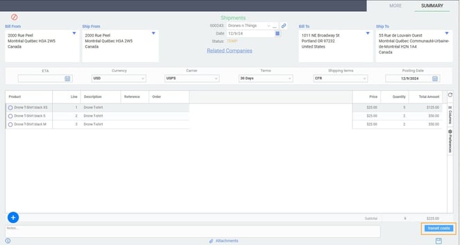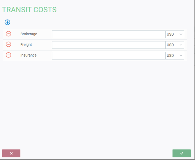 Use the transit costs button to enter costs when you receive the various invoices from your vendors for these costs.
