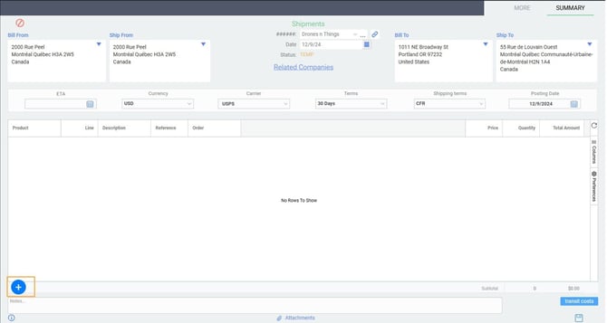 To add a product or line item to your shipment, click the add product button at the bottom left-hand side of the line item area.