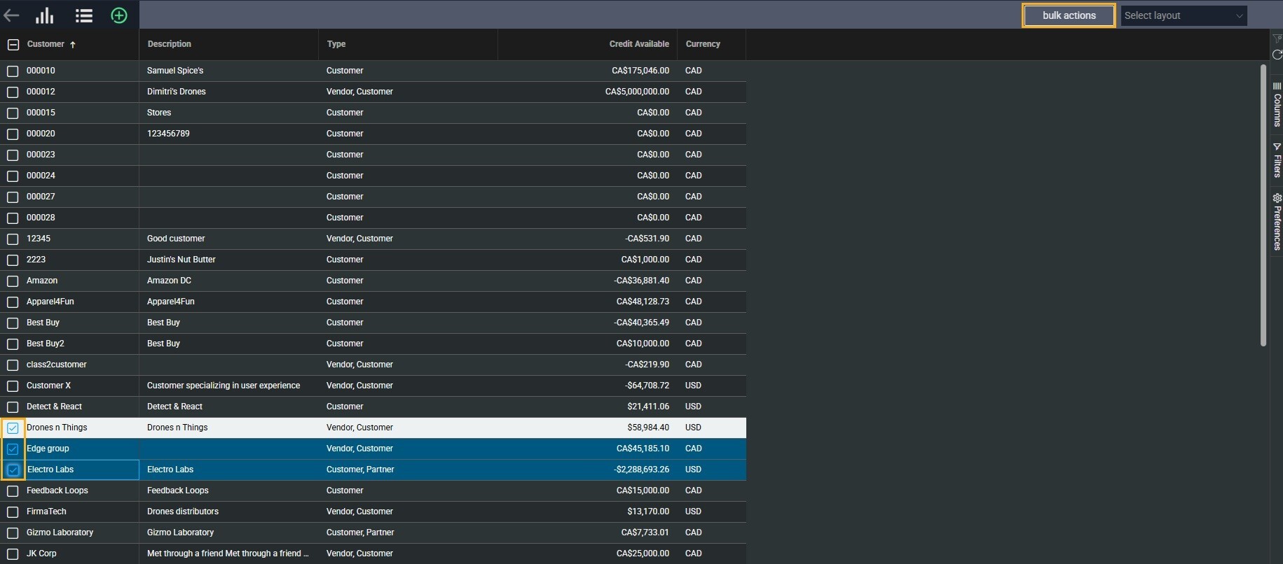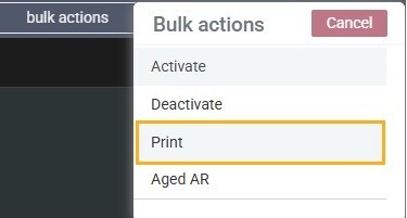If you want to print multiple customer statements at one time, select multiple customers using the check boxes at the left side of the customer list view screen. This will activate the bulk actions option at the top right hand corner of the list view screen.