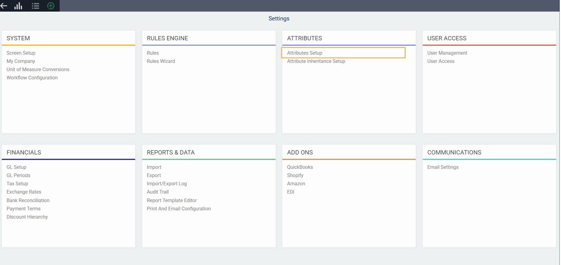 Under the attributes card, click on attribute setup to access the attributes setup module.