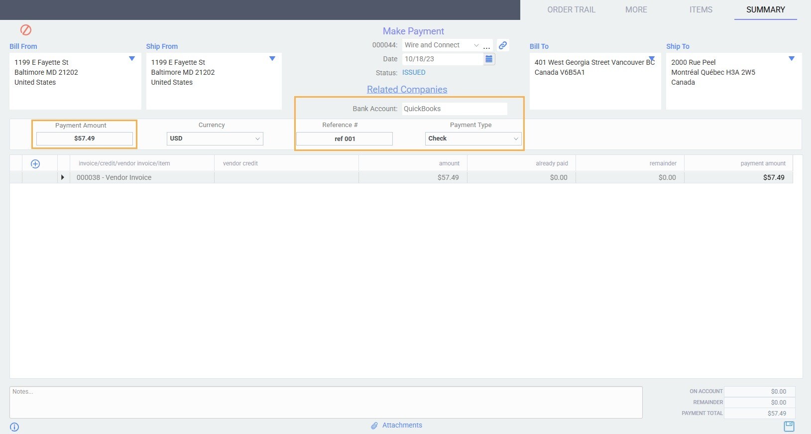 In QuickBooks Online you can see that the exported vendor invoice is now marked as paid and that the make payment has been created (displayed as Bill and Bill Payment respectively).