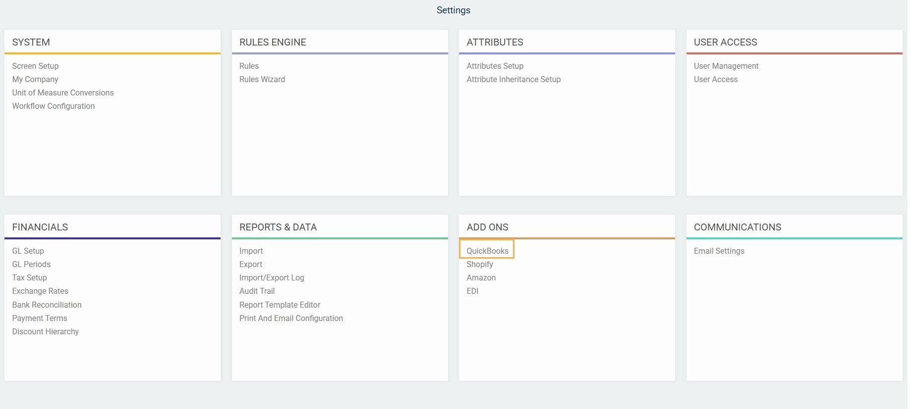 From anywhere in Paragon, navigate to the QuickBooks setup screen from the settings page.