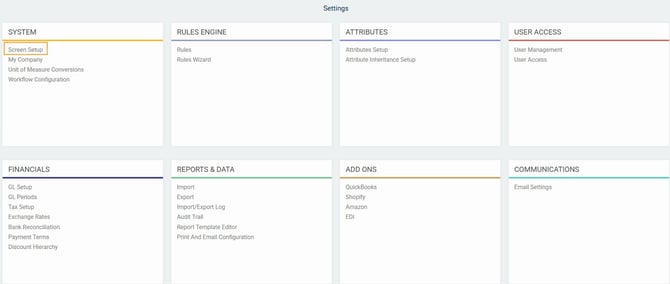 To export purchase orders and receipts to QuickBooks you will need to add discounts and other charges based attributes to each transaction screen. First, navigate to screen setup from the settings page.