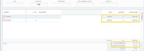 For purchase orders, you will need to add line discounts, header discounts, and other charges, but receipt only requires line discounts.