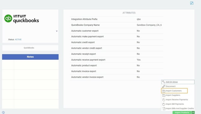 Click the action list button on the QuickBooks setup or attribute page to get the options for importing: