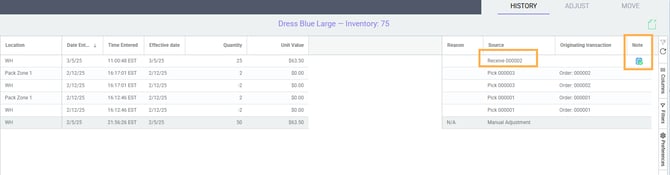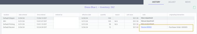 The Originating Transaction column helps you determine the transaction that initiated the inventory update.