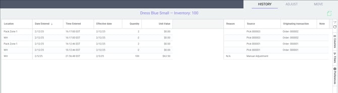 The AG grid functionality is available on the item inventory history tab to help you read and understand your past stock movements. You can control which columns you see, how data is sorted, and easily filter on most attributes.