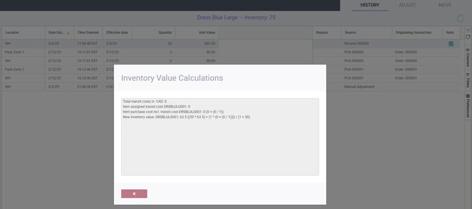 Being able to quickly evaluate how your incoming cost of goods has been calculated is necessary when running a warehouse. Detailed stock valuation recaps are available in the inventory history screen for all completed receipts.