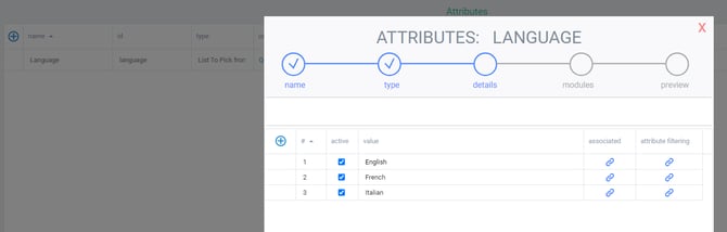 Before we begin, make sure that the attribute called language contains the options you would like to use. This attribute can be found in attribute setup in the settings menu.
