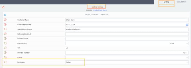 Configuration is complete. You can now create your transaction to see the translated attribute in action. Create an order and make sure to fill the language attribute in the more tab (if it is not already inherited from the customer module).