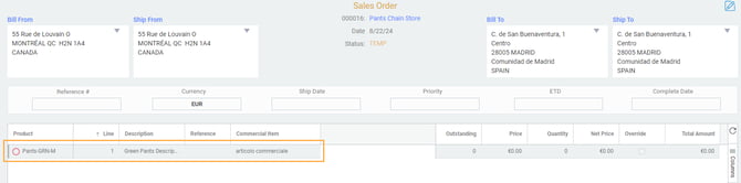 Add your product as an order line and see that the commercial item attribute has been added in the correct language.
