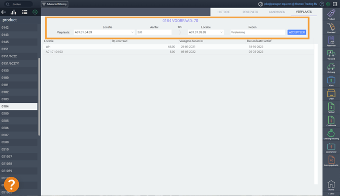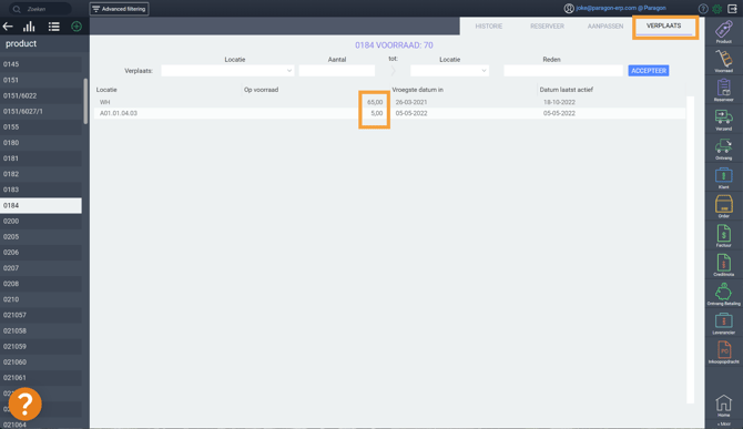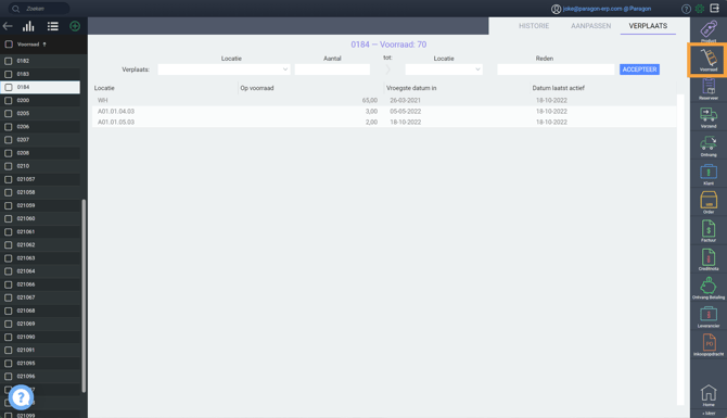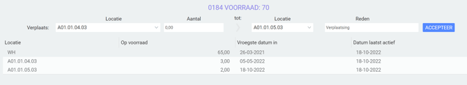 Als voorraad naar een andere voorraadlocatie moet worden verplaatst, gebruik je de optie VERPLAATS. Net als bij het scherm AANPASSEN, wordt hier de voorraad per voorraadlocatie weergegeven.