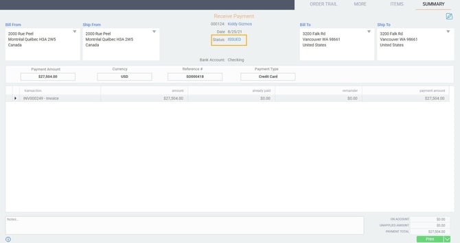 From there, navigate to the transaction in which you recorded the payment. The transaction should be in issued or completed status.