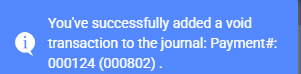 After choosing accept, the transaction's status will change to voided. Also, notifications will appear in the top right corner of your screen, informing you that a journal entry was created.