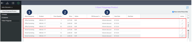 The configuration shows for 2 different customer groups (1), different volume prices (2) for the same product.