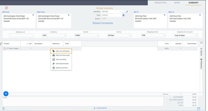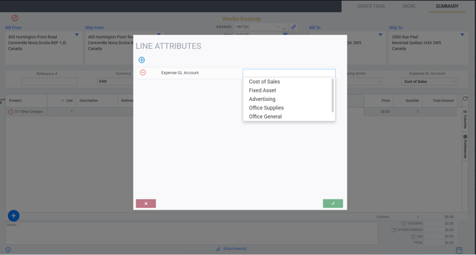 A modal will pop up, and you'll be prompted to choose which attributes to add to the line. Your expense account attribute can be selected to determine which accounts are to be affected by each invoice line.