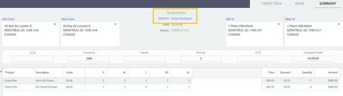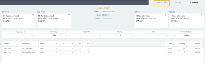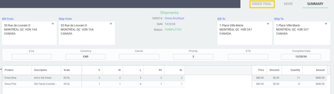 Now that we are looking at the related shipment, we can see that there is also an order trail tab in this module. If we open it, we see that all the same related transactions can be viewed from here as well.