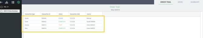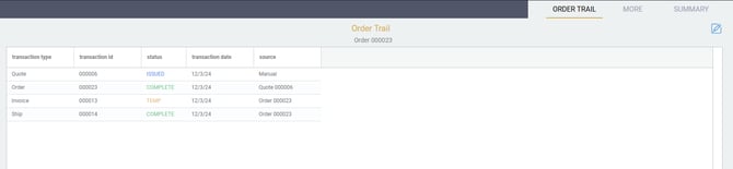 Most projects begin with a sales order and move forward from there (through picking, packing, shipping, etc.). Therefore, the order trail tab will present you with sequential transaction information starting from the order stage. No matter your workflow, all related transactions will be listed.
