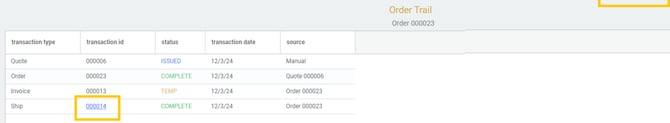 While analyzing the information on the order trail tab, you may decide that more information is needed. Not a problem, click on the hyperlinked transaction number or ID on the screen to be immediately navigated to that transaction in inquiry mode.